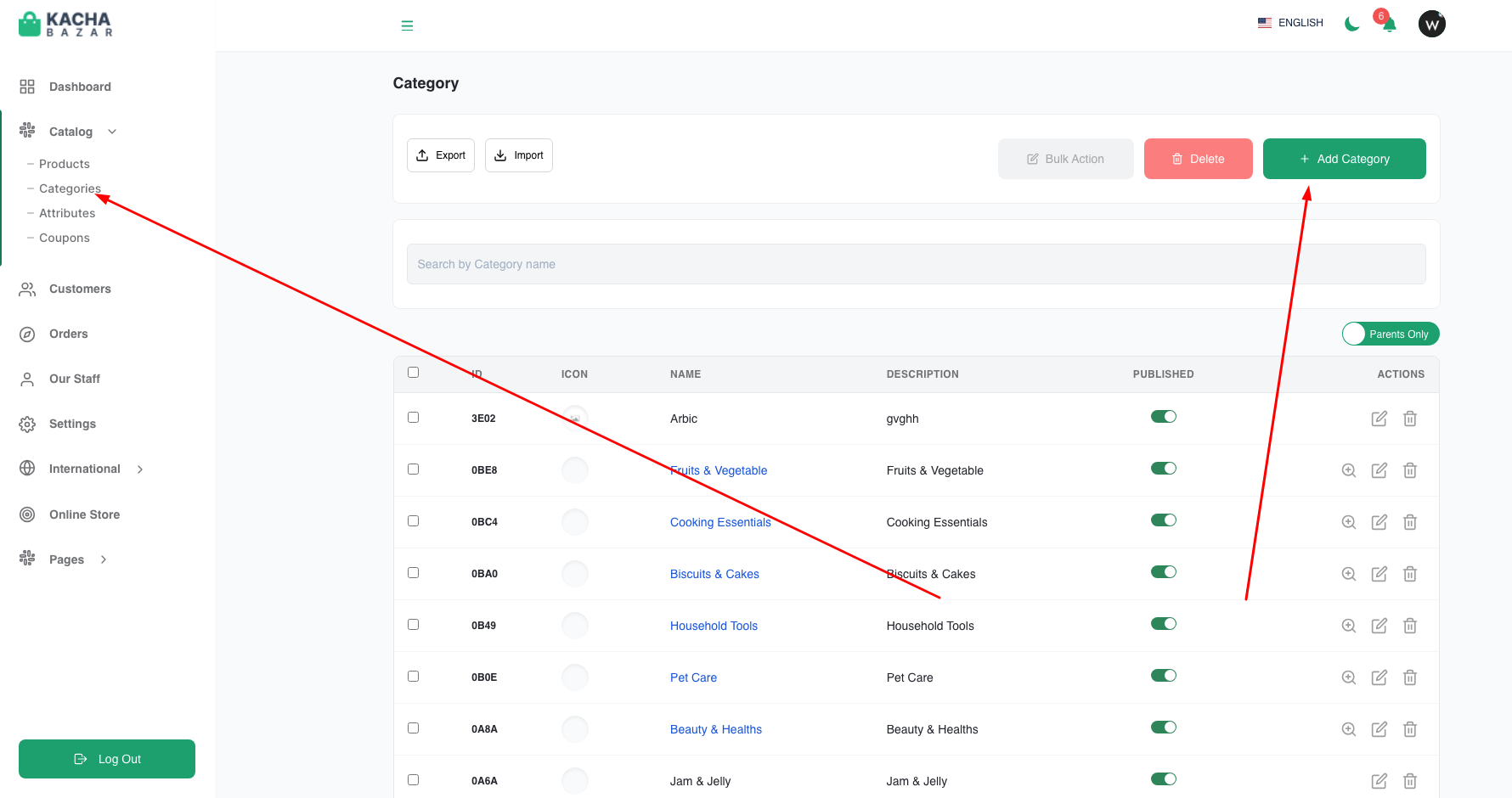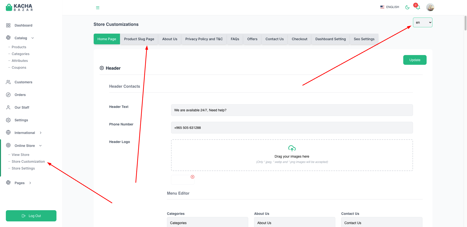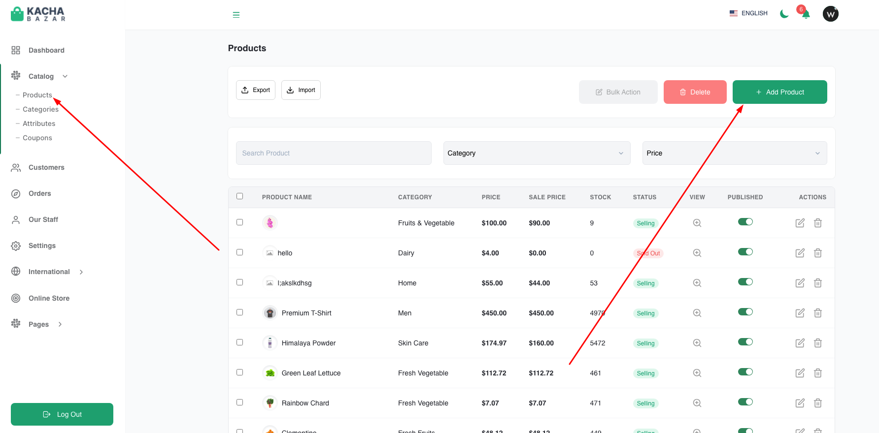 You can add with and without Combination product from here with all necessary information. Also you can import and export bulk product data from here. When you adding product select the language from Select option on drawer right corner for adding your preferred language.