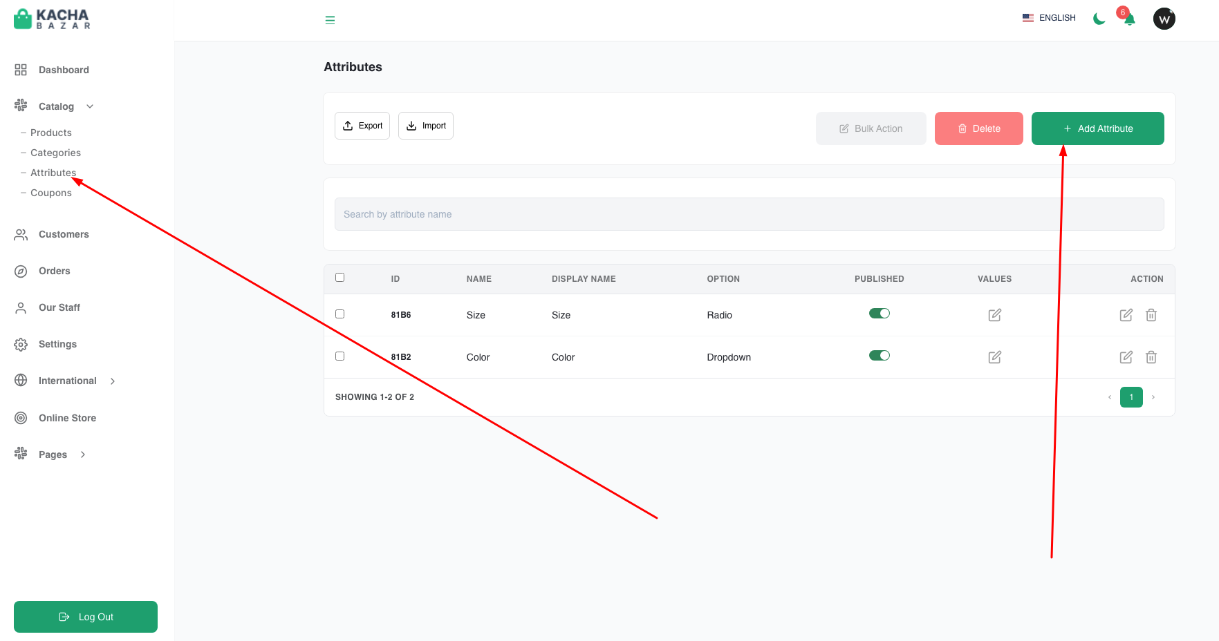 You can add attribute from here with all necessary information. Also you can import and export bulk data from here. When you adding attribute select the language from Select option on drawer right corner for adding your preferred language.