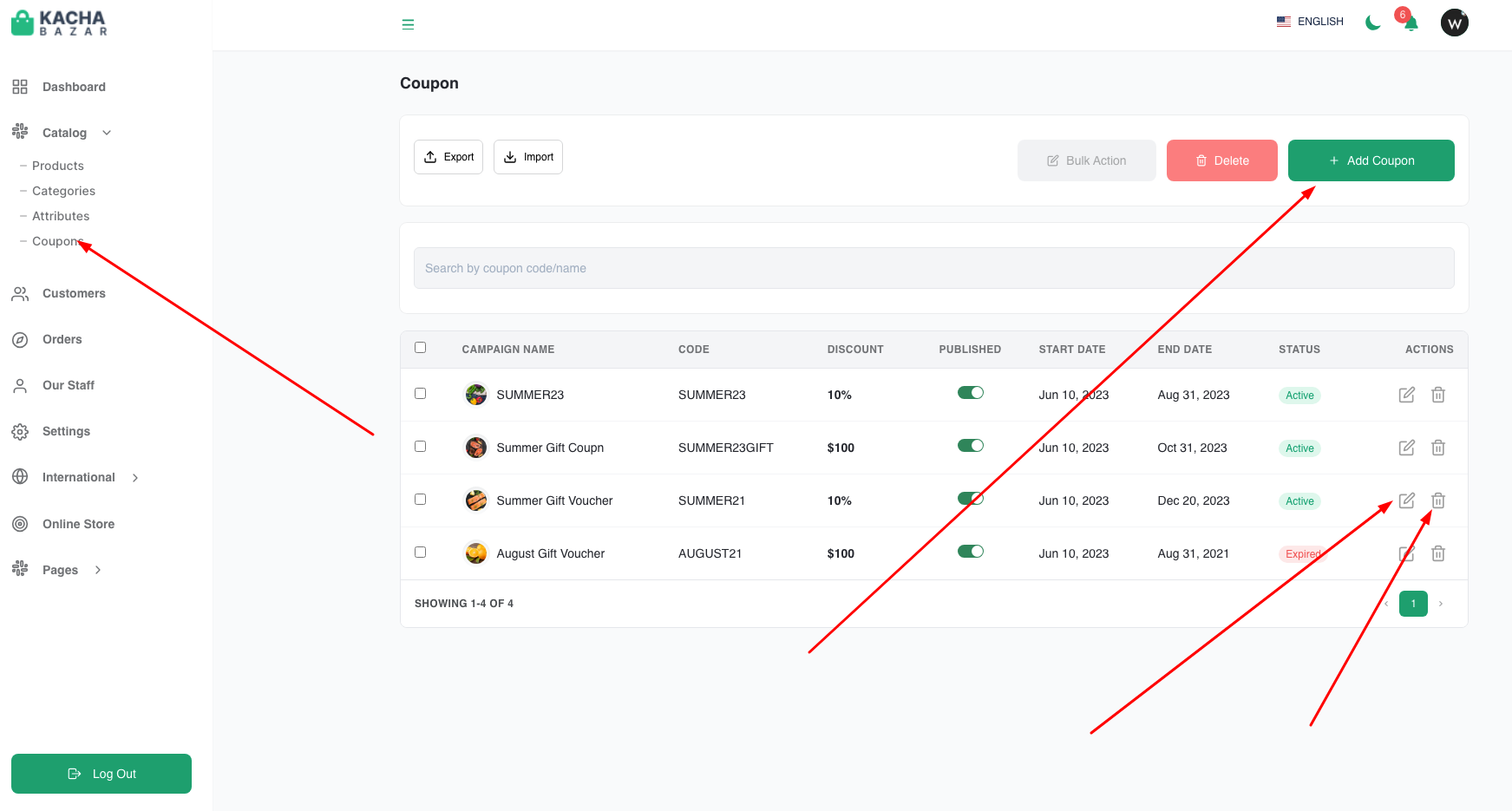 You can add coupon from here with all necessary information. Also you can import and export bulk data from here. When you adding coupon select the language from Select option on drawer right corner for adding your preferred language.