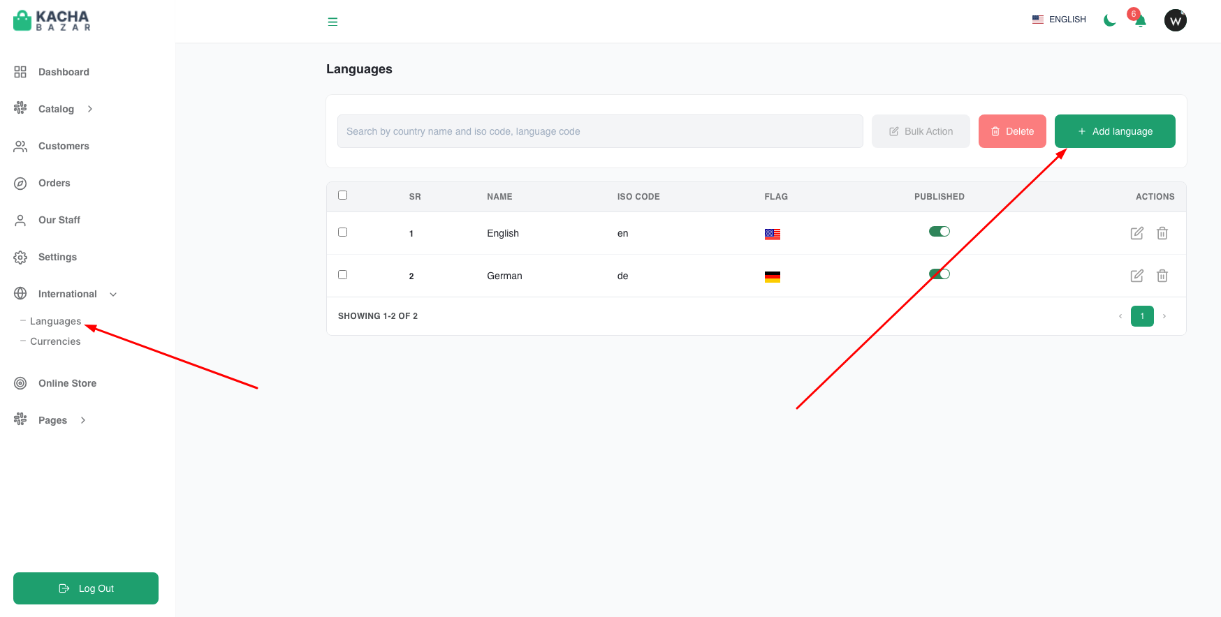 You can add language from here with all necessary information. This language will show in store language select drop-down, also in all dynamic data adding drawer.